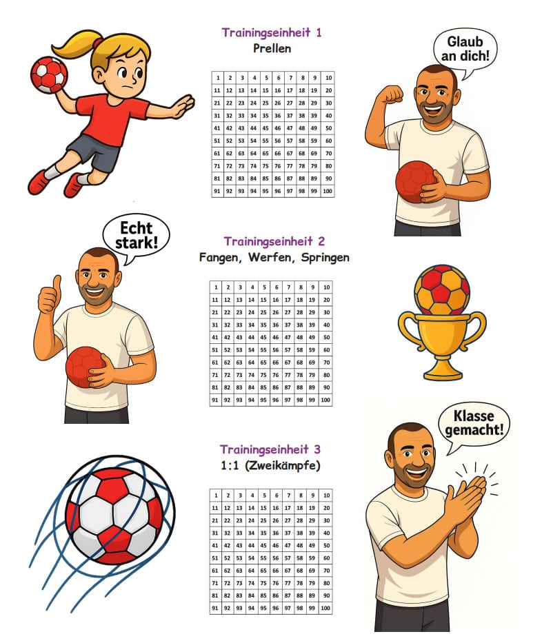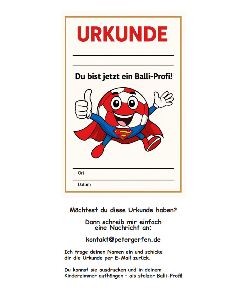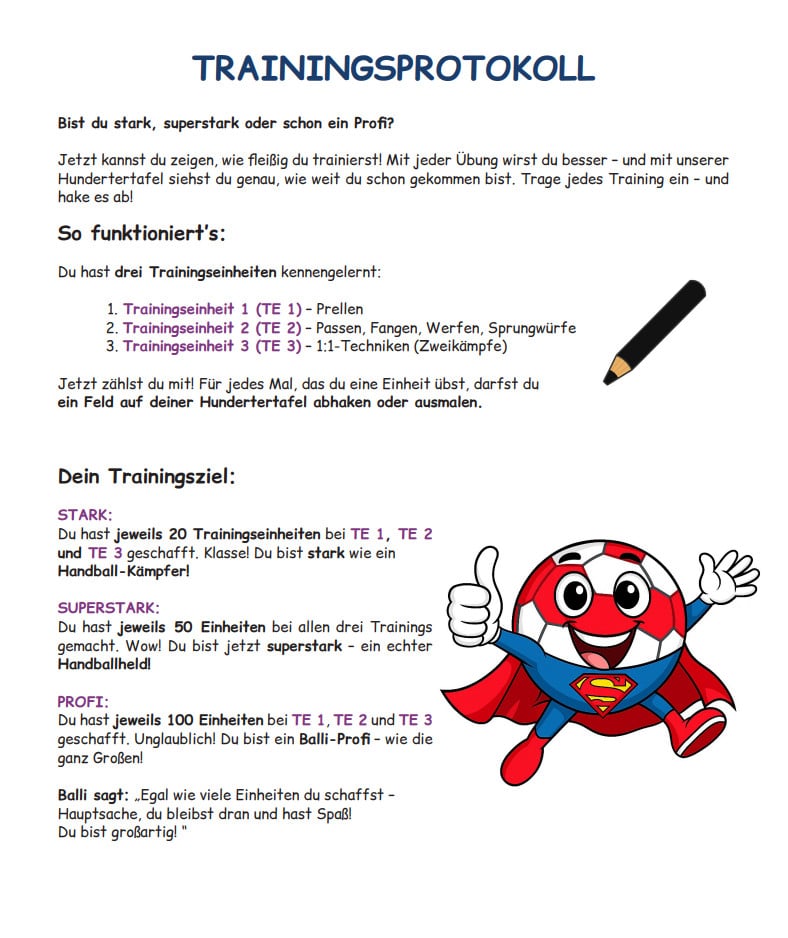 Mit der beiliegenden Hunderttafel können Kinder ihre Fortschritte festhalten, Trainingseinheiten abhaken und am Ende stolz ihre „Balli-Profi-Urkunde“ erhalten – als Motivation und Belohnung zugleich.
